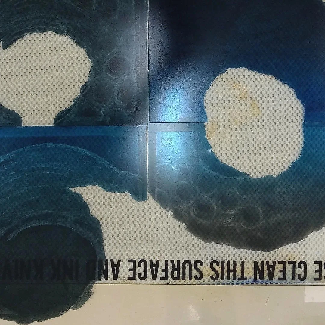 The nature and amount of fibers used will determine the function of the completed sheet of paper. For example, the thicker sheets are sturdy and are ready to hang once they dry. They function as drawings or as sculptures and many sheets lend themselves to installation work. Lighting decisions will bring out different qualities in my sculptural paper pieces. In contrast, my thinnest paper drawings are useful in my letterpress projects. These thin drawings are ideal for pressure printing projects; I have been making limited edition maps, books, prints, and posters. After I finish printing with these low-relief paper drawings, I can then recycle the fibers into new projects. Images of a map project titled “What We Have Left” are shown on this page. I cut the prints into sections and adhere them to book cloth to make folding maps of places. “What We Have Left” is a map of a remnant oak savanna in Iowa City, upper City Park. The maps are depicting elements of the oak savanna, in the black ink I am illustrating the tree trunks themselves, especially the older trees with knobby burls.